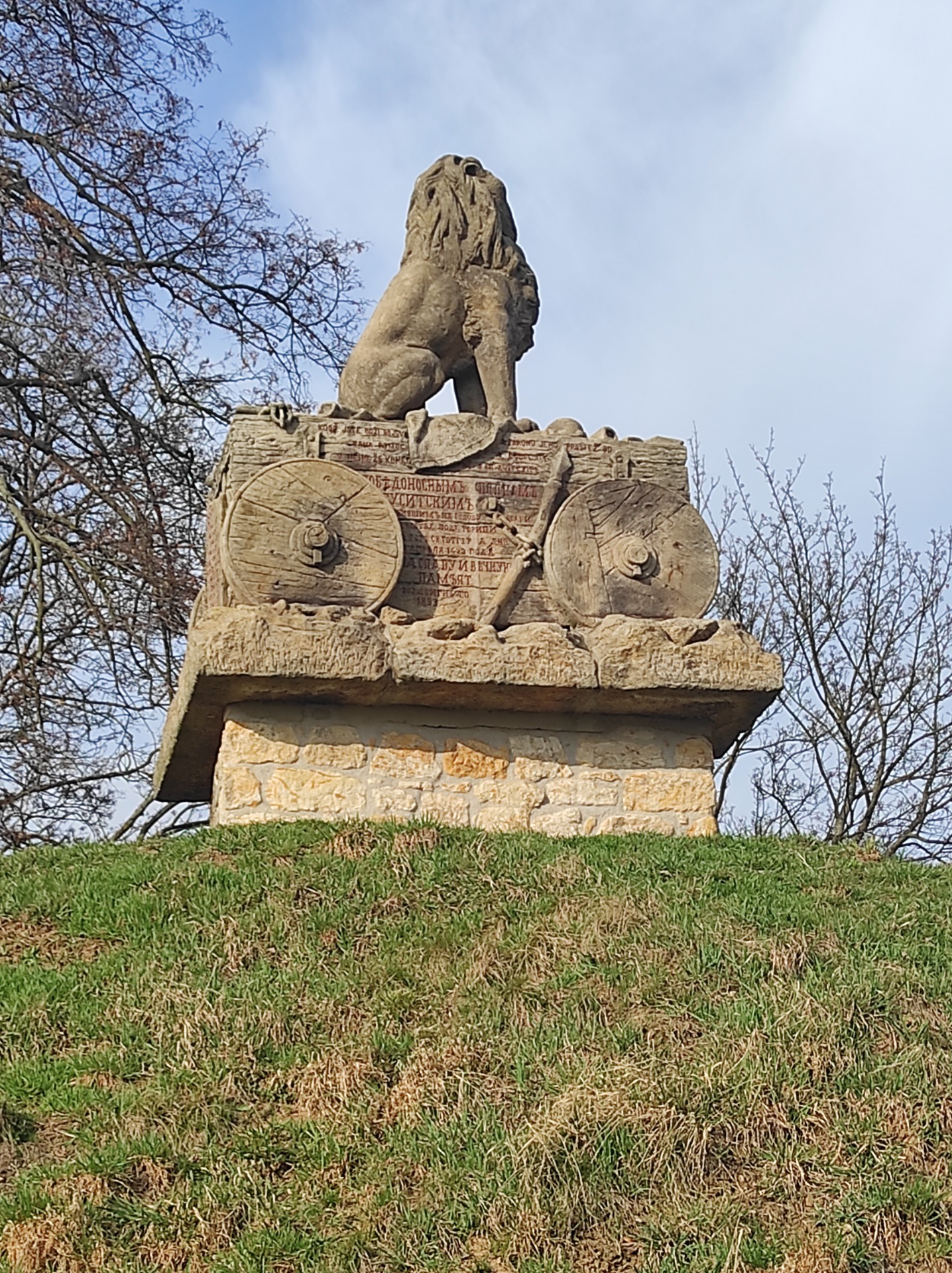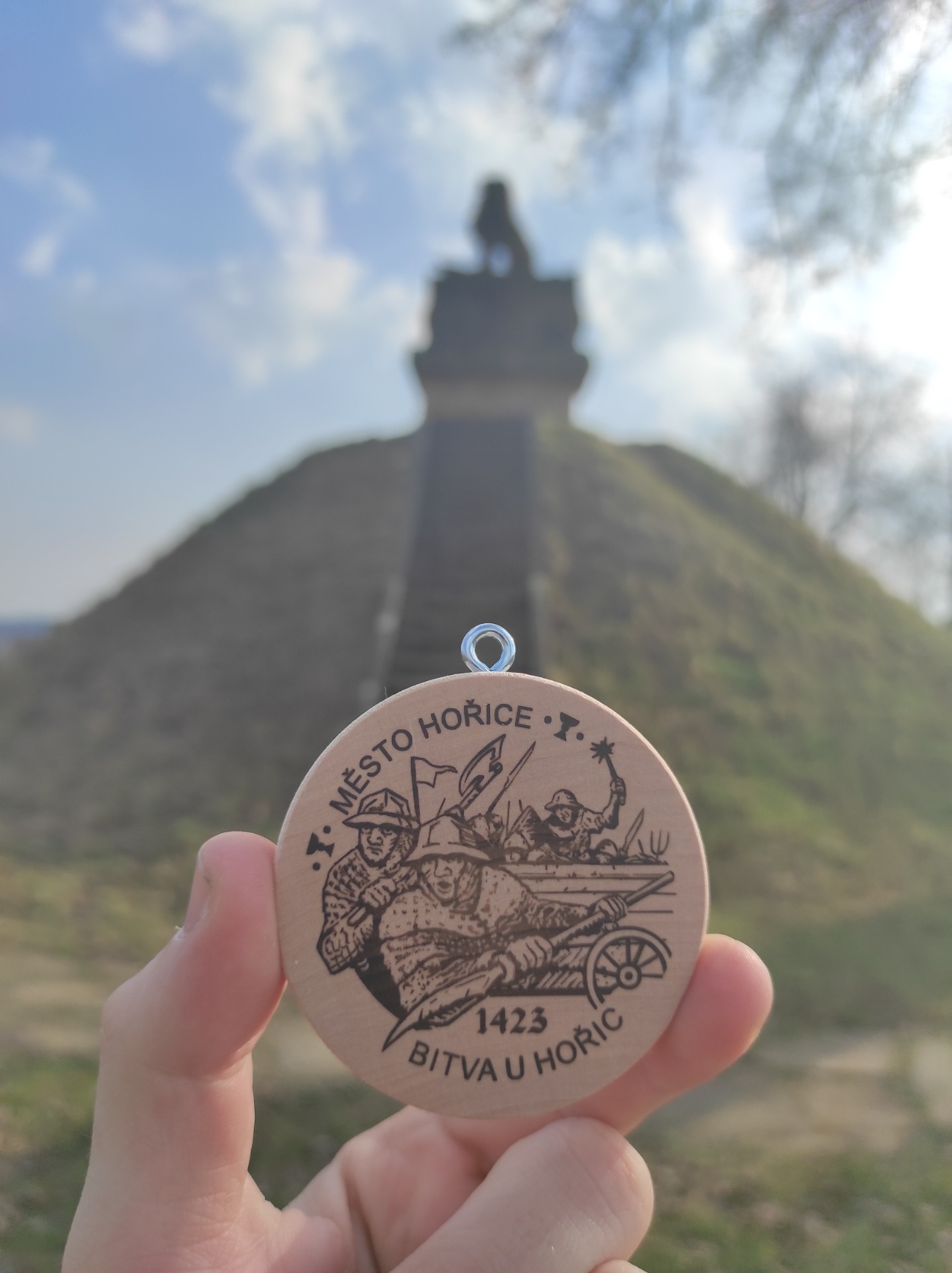 Mě velmi zaujalo, že jsou na voze vypsány všechny husitské bitvy. Opět jsem si zde nafotil turistickou známku s mohylou. Kromě klasické známky s pořadovým číslem byla vydána i speciální edice k 600. výročí úmrtí Jana Žižky, přičemž jedna z nich má motiv bitvy u Hořic – i tuhle známku jsem si nafotil.